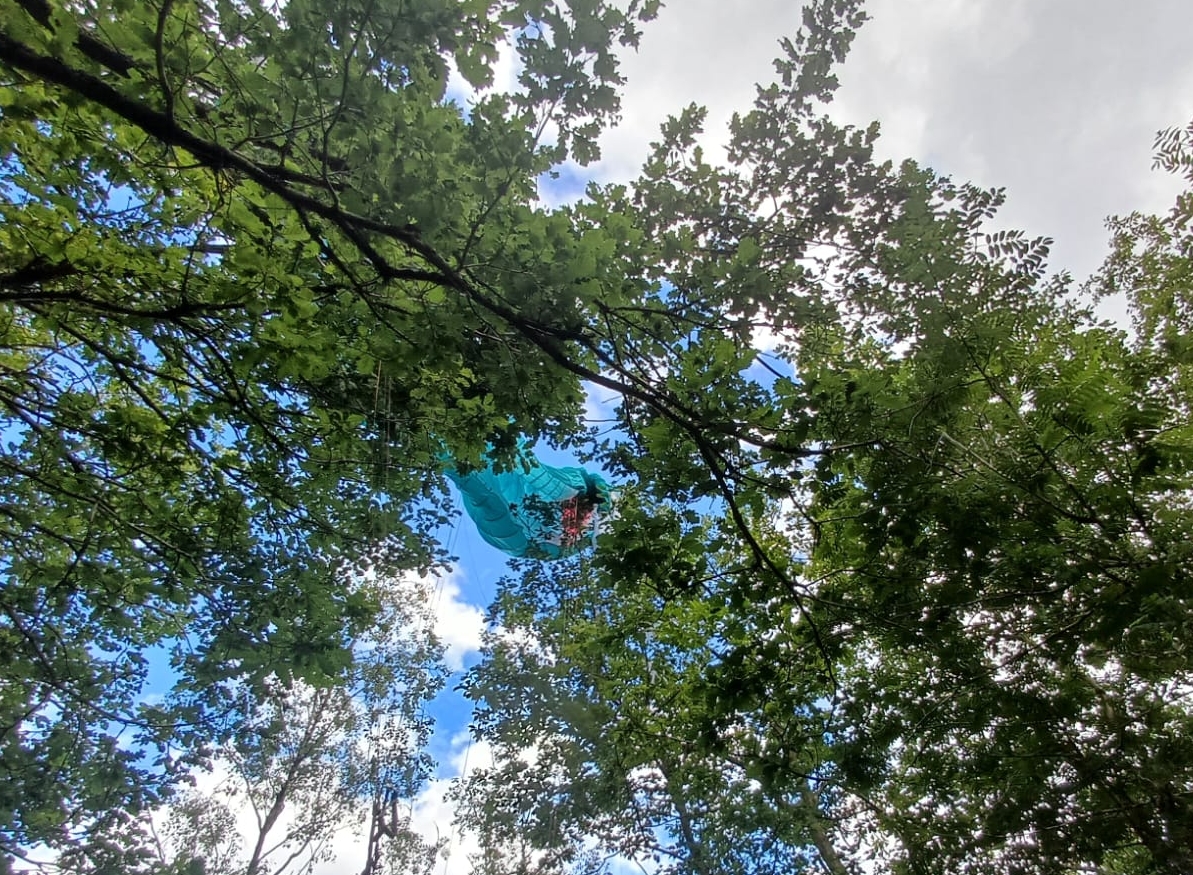 Sous le déco, le pilote est au sol, la voile dans les cimes et les écureuils en chemin...
