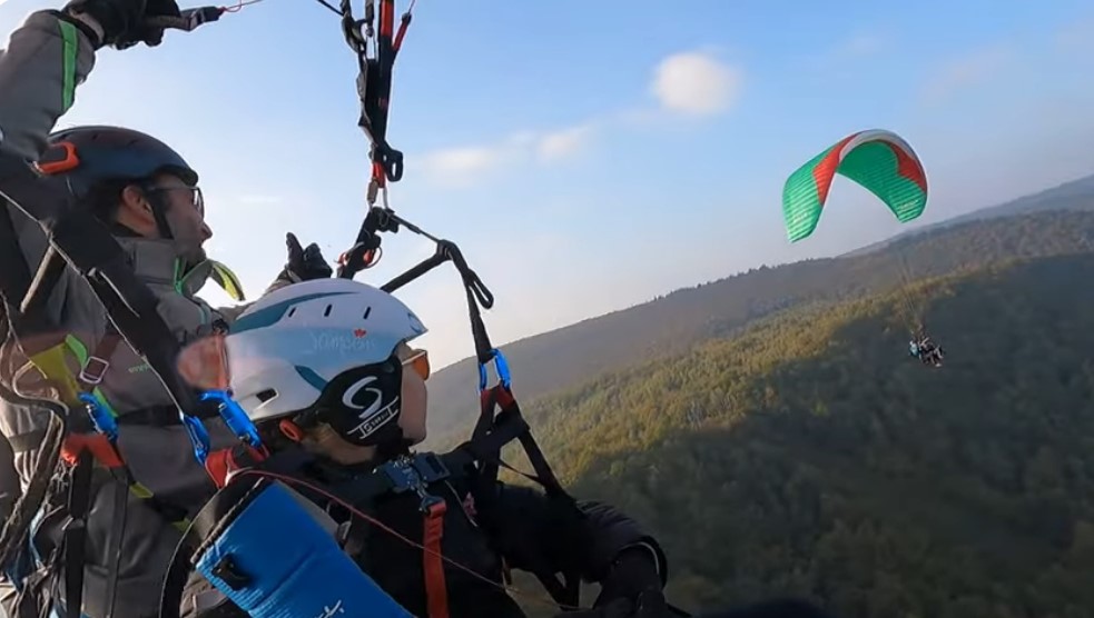 Bruno avec sa passagère au dessus de notre forêt Ardennaise (Fumay en arrière plan)